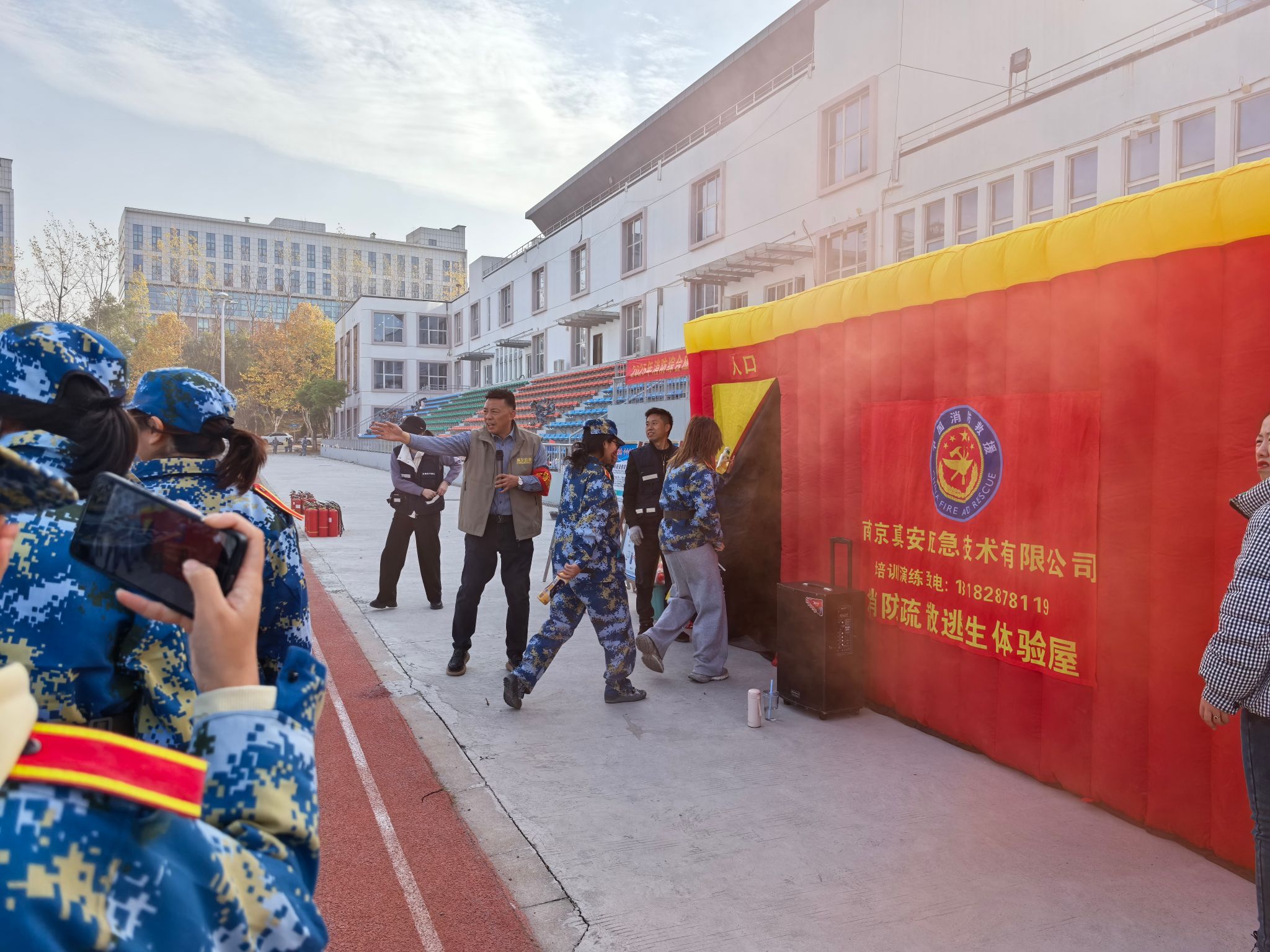 为增强演练的真实感和实效性,此次活动特别设置了模拟火场逃生演练环节。参训师生分批进入高度模拟真实火场的“逃生体验舱”,亲身体验在浓烟、黑暗环境下的紧急疏散。在专业人员指导下,师生们学习在恶劣环境下克服恐慌、选择正确逃生路径与方法。这种沉浸式演练有效弥补了理论学习与实际应用之间的差距,让师生在实践中掌握了低姿撤离、湿毛巾捂口鼻、辨识疏散指示标志与应急照明等实用技巧。