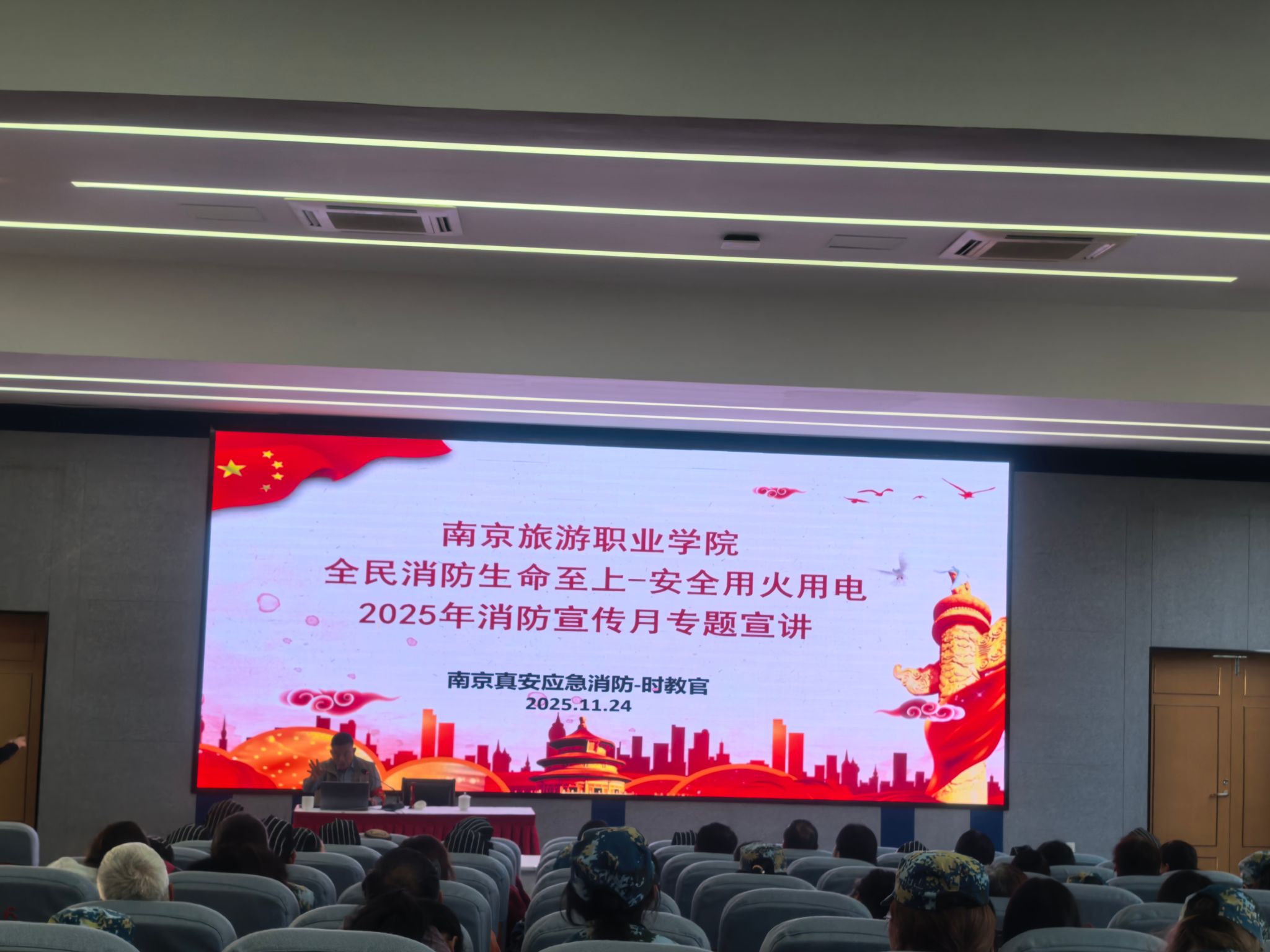 为积极营造“人人参与消防”的校园安全氛围,南京旅游职业学院于11月24日开展了消防宣传月系列活动。活动邀请安全生产及消防培训特级教员时真银为大一新生和学校三产人员开展消防安全讲座,并相继组织了应急疏散演练、模拟逃生舱体验和消防灭火比赛。此次系列活动紧扣“全民消防、生命至上——安全用火用电”主题,旨在全面提升师生火灾防范意识与应急自救能力,构建平安和谐校园。本次活动分为四个模块: