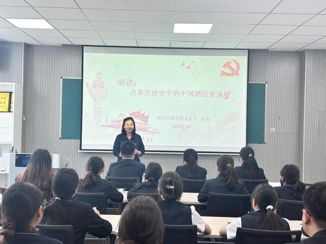 为深入学习改革开放史,了解中国酒店业在这一伟大进程中的发展变迁,2024年10月15日,酒店管理学院院长苏炜在J1104教室开展了“改革开放史中的中国酒店业发展”专题党课,25名入党积极分子积极参与,共同探寻中国酒店业在改革开放进程中的辉煌历程。