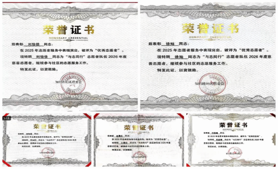 表彰环节中,社区领导宣读 2025 年度优秀志愿者名单,逐一为获奖者颁发荣誉证书,现场掌声阵阵。其中,“满天星”志愿服务队的王晨曦、何思晴、李知桐、徐灿、刘怡佳 5 名成员凭借突出表现获评“优秀志愿者”,并被特聘为“与志同行”志愿者队伍2026年度慈善志愿者。