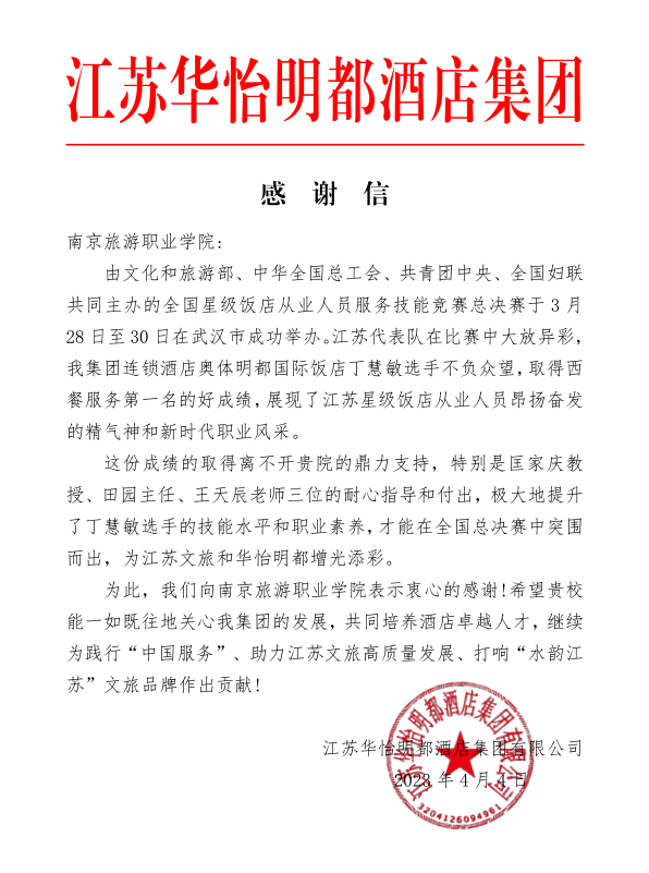 近日,江苏省文化和旅游厅市场管理处、金陵饭店股份有限公司、江苏华怡明都酒店集团向我院发来感谢信,对专职教师参与全国星级饭店从业人员服务技能竞赛工作表示感谢。