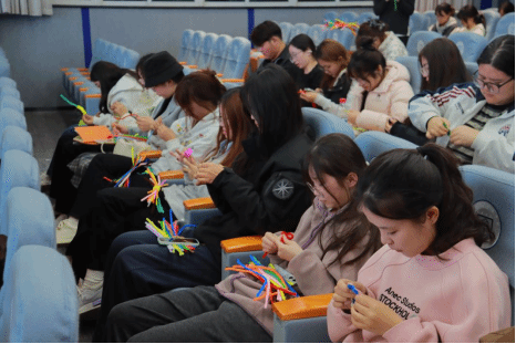 在实践环节,陈维荣首先明确指出心理委员“四重角色”与工作原则,重点开展了扭扭棒创意实践。她展示了往届学生的扭扭棒作品,用色彩丰富的花朵、萌趣的小动物等作品,让在场心理委员直观感受劳动与心理调节的联结。现场学员们兴趣盎然,手持彩色扭扭棒,通过弯、折、绕、拧等动作展开创作。有的专注设计造型,有的交流技巧,普通扭扭棒在大家手中逐渐变成创意作品,不少同学完成后主动分享创作思路,氛围轻松融洽,培训现场充满活力。这一实践环节,让心理委员们亲身体验“劳动调节情绪、孵化自信”的价值,也为他们后续开展班级心理工作提供了可借鉴的实践方法。