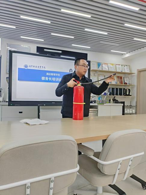为进一步加强学生宿舍安全管理,提升宿舍长的责任意识与应急处理能力,酒店管理学院于12月4日组织全院宿舍长召开了专题培训会。本次培训由学院宿舍管理专员林超老师主讲,围绕宿舍环境卫生、违规物品清查、秋冬季防火用电安全及突发事件应急处置等内容展开系统讲解,并现场演示灭火器材使用方法,得到了与会同学的积极响应。
