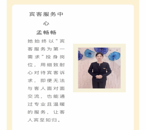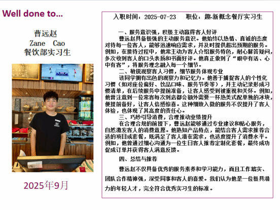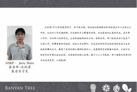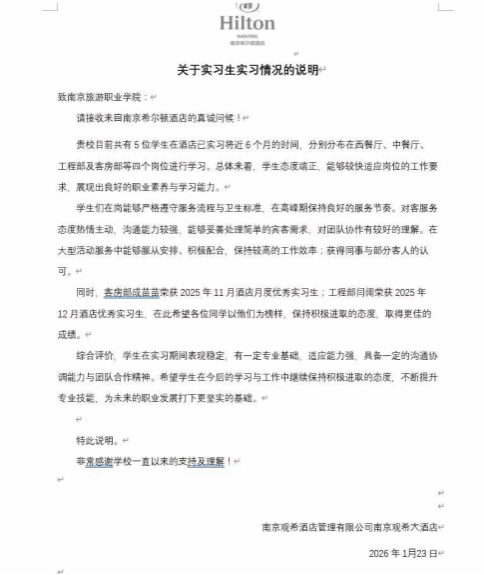酒店管理学院多名学生实习期间爱岗敬业、刻苦学习、表现出色,被北京丽都皇冠假日酒店、苏州金鸡湖凯宾斯基酒店、南京涵碧楼酒店、南京凯宾斯基酒店、南京园博园悦榕庄酒店、南京苏宁索菲特酒店、南京希尔顿酒店7家企业授予“优秀实习生”的荣誉称号。2名同学获得顾客认可并致信感谢。各合作企业负责人对我院实习生的综合素质、专业能力及工作表现给予高度评价,充分肯定了学院人才培养工作的成效,同时也结合岗位需求,对学院专业教学、实习安排等方面提出了合理化建议。