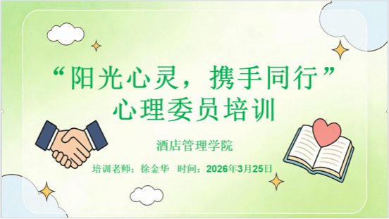 为扎实推进高校心理健康教育工作,健全学院心理健康防护网络,着力提升班级心理委员的朋辈帮扶能力与专业水平,2026年3月25日下午,酒店管理学院在教学楼J3302教室成功举办“阳光心灵,携手同行”心理委员专题培训。作为学院“五育润心 沐光同行”3·20心理健康周的重点活动,本次培训特邀学校心理中心徐金华老师担任主讲人,学院心理专员陈维荣老师主持,24级、25级全体班级心理委员参加培训。