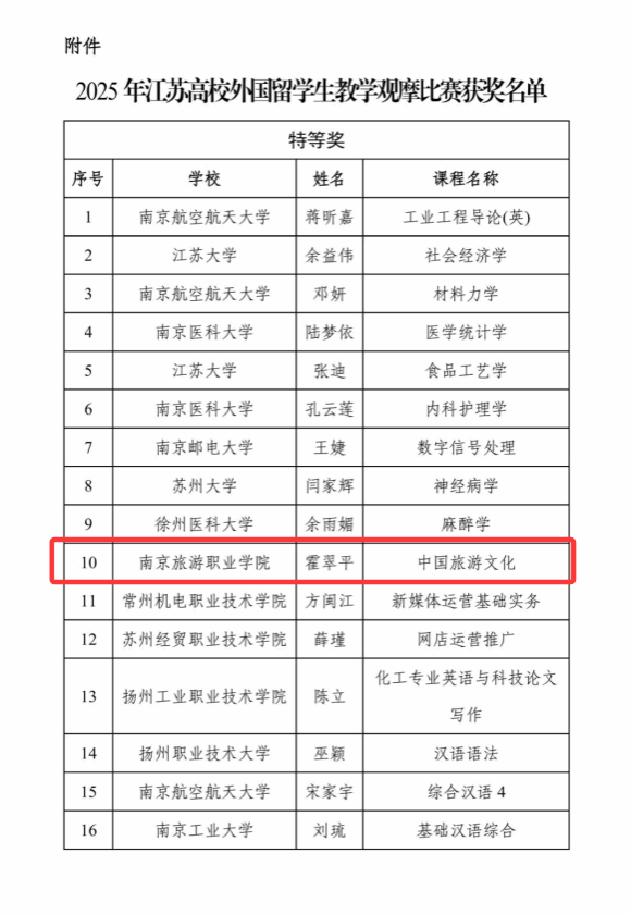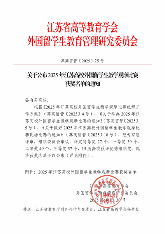 本次获奖充分体现了我院教师在外国留学生教育领域的专业实力,展示了学院在推进国际化办学和提升教育质量方面的积极成果。我院将以此为动力,持续深化教学改革,打造高质量国际课堂,为“留学江苏”品牌建设贡献更大力量。