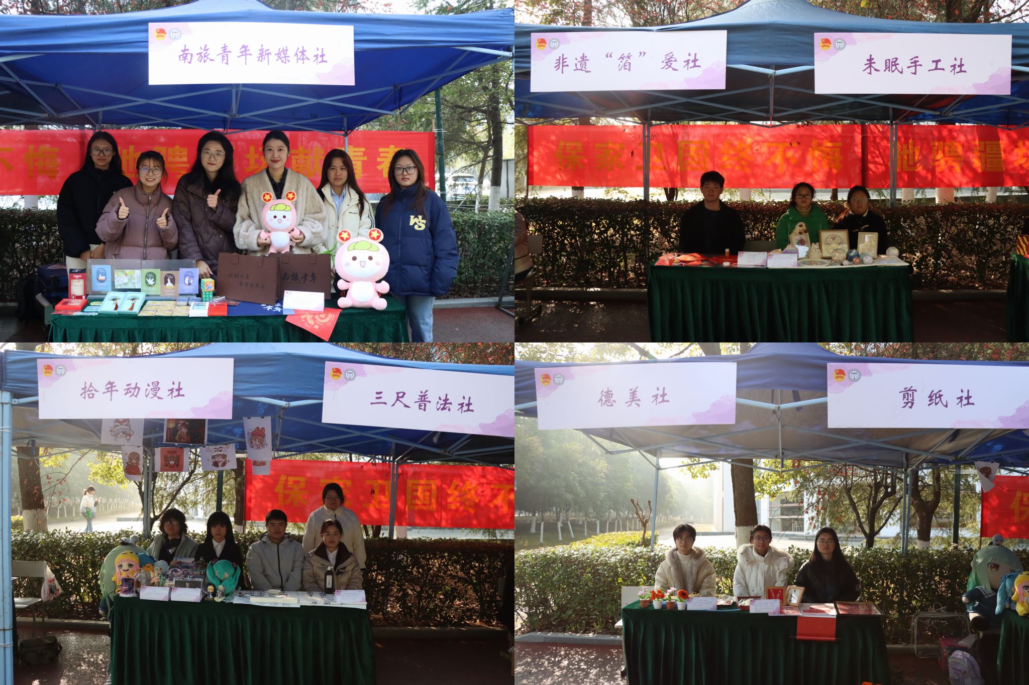 12月18日上午,旅享家咖啡厅前设置了七个社团展示区,同学们巧妙融合手工制作与现场互动,其中包括南旅青年新媒体社的校园文创展、未眠手工社的“古鞠新豆:手作艺术双生展”、非遗“箔”爱社的金箔映剪纸展、三尺普法社的书法展、拾年动漫社的手绘与玩偶展、剪纸社的创意剪纸展,以及德美社的非遗新绎主题展。