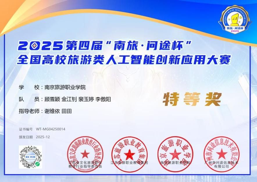 2025年12月28日,由江苏省文化旅游职业教育行业指导委员会、江苏旅游职业教育集团、南京旅游职业学院、广州市问途信息技术有限公司主办,南京旅游职业学院和广州市问途信息技术有限公司承办的2025“南旅•问途杯”第四届全国高校旅游类人工智能创新应用大赛总决赛落下帷幕。本次大赛是国内首个聚焦旅游领域人工智能创新应用的赛事,以“人工智能技术创新实践能力”为核心,考查了学生从AI工具“使用者”向应用“创造者”的跃升。