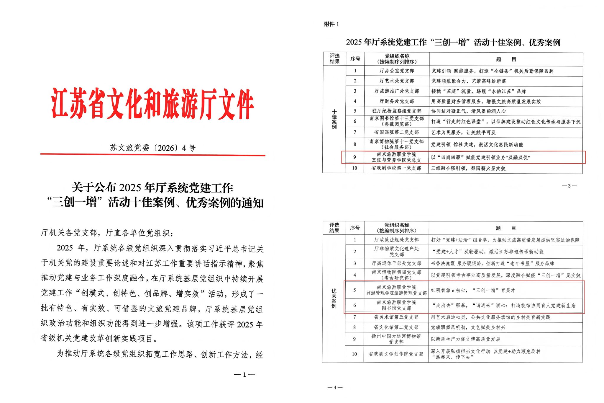 近日,江苏省文化和旅游厅公布了2025年度厅系统党建工作“三创一增”活动十佳案例、优秀案例的入选名单,南京旅游职业学院烹饪与营养学院党总支——以“四岗四驱”赋能党建引领业务“双融双促”案例获评厅系统党建工作“三创一增”活动十佳案例,旅游管理学院旅游管理党支部——红研智旅e初心,“三创一增”育英才案例以及机关党总支图书馆党支部——“走出去”强基,“请进来”润心:打造校馆协同育人党建新生态案例分别获批厅系统党建工作“三创一增”活动优秀案例。
