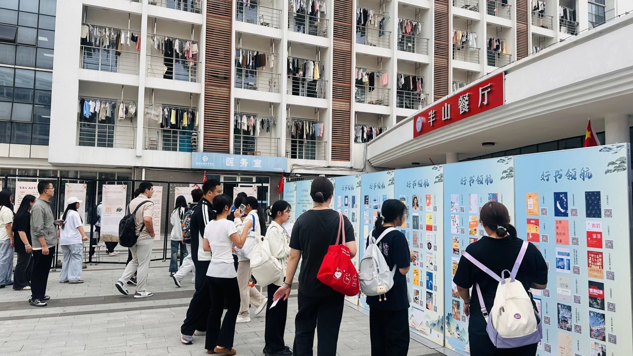 活动现场,内容丰富、形式多样的展览吸引了众多学生的目光。其中,既有“食为天 庆丰年”中国古代饮食文化典籍展,让人领略到中华饮食文化的深厚底蕴;又有“食品安全知识”“节约粮食倡议”“营养健康知识”等专题展板;还有“好书领航”——电子书推介限定专场,精选百余册优质电子书供师生现场扫码阅读,内容涵盖饮食文化、历史人文、文学艺术、社会科学等多个领域,以图文并茂的形式,生动直观地向学生们传递了珍惜粮食、注重健康饮食的重要性,全方位展示了中华饮食文化的博大精深。