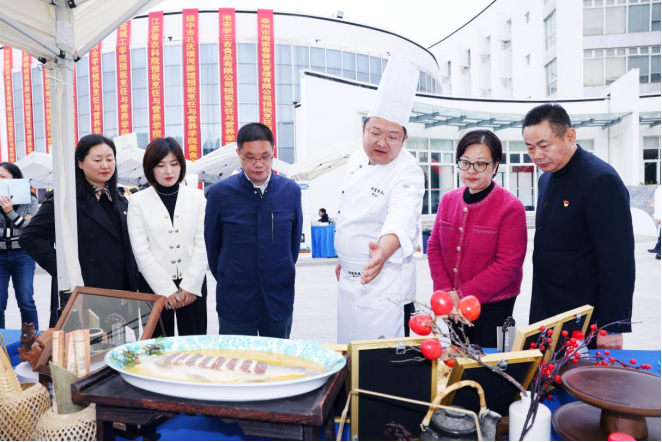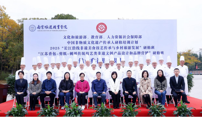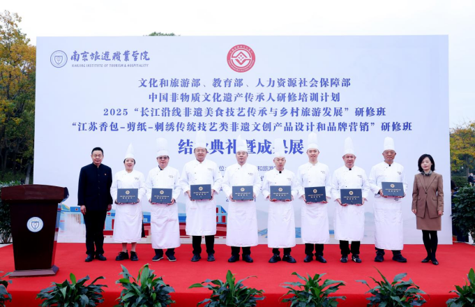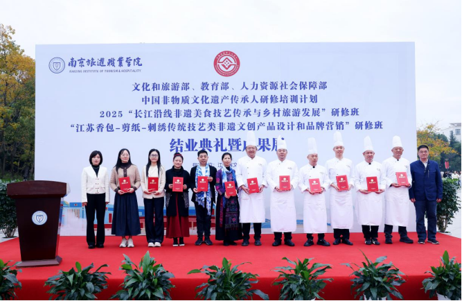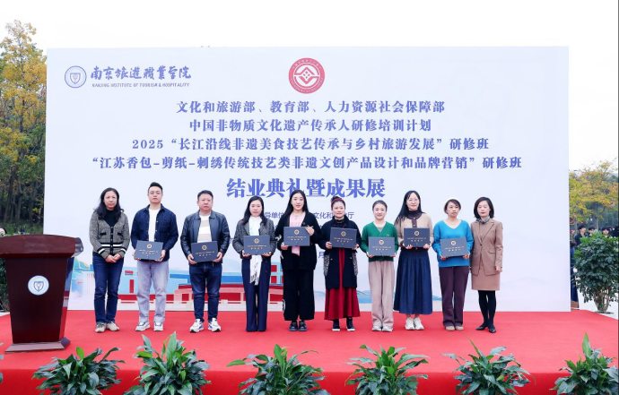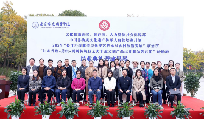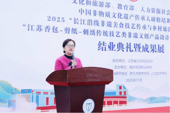 11月6日上午,由文化和旅游部、教育部、人力资源社会保障部联合实施的“中国非物质文化遗产传承人研修培训计划”——2025年“长江沿线中餐烹饪技艺传承与乡村旅游发展”暨“江苏香包、剪纸、刺绣传统技艺类非遗文创产品设计和品牌营销”研修班结业典礼在我院飞燕广场隆重举行。江苏省文化和旅游厅非遗处副处长孔叶萍、江苏省戏剧学校党委委员、副校长周黛瑜,南京旅游职业学院党委书记叶凌波、副院长洪涛等领导出席典礼。典礼由科研开发处副处长张宁主持。