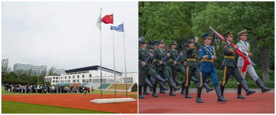 深秋晨曦中,升旗仪式在庄严肃穆的氛围中正式开始。全体师生整齐列队,肃立注目。伴随着雄壮的国歌声,鲜艳的五星红旗冉冉升起,全场齐声高唱国歌,表达对祖国的无限热爱和崇高敬意。