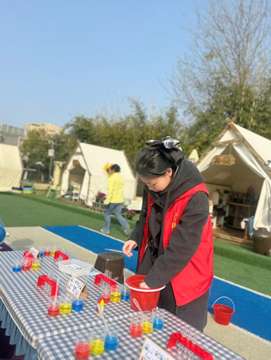 活动前期,志愿者们精心筹备、周密部署,全面做好安全与流程设计。户外活动区合理规划动线,规范摆放器材与座椅,细致排查安全隐患;科普体验区内,实验操作台有序搭建,三原色实验器材、磁力小车组件、干冰实验材料等分类布置,并配以清晰直观的指引标识,为活动顺利开展提供了有力保障。