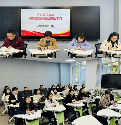 为深入学习贯彻党的二十届四中全会精神,推动理论学习与学院育人工作深度融合,11月19日下午,旅游外语学院在J3106教室召开2025年第6次教职工集体政治理论学习会议,会议由党总支书记陈海艳主持。