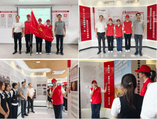 仪式上,张骏与江良圣为江宁区铸牢中华民族共同体意识“石榴籽”宣讲队授旗,并勉励宣讲队员讲好民族团结进步故事。授旗结束后,与会领导、师生来到江宁区铸牢中华民族共同体意识体验站,“石榴籽”宣讲队成员结合丰富的展览内容,从中华民族多元一体格局的形成、中国共产党民族政策的发展以及江宁区铸牢中华民族共同体意识的实践三个方面带来了精彩的讲解,深入讲述了各民族交往交流交融的深厚历史。