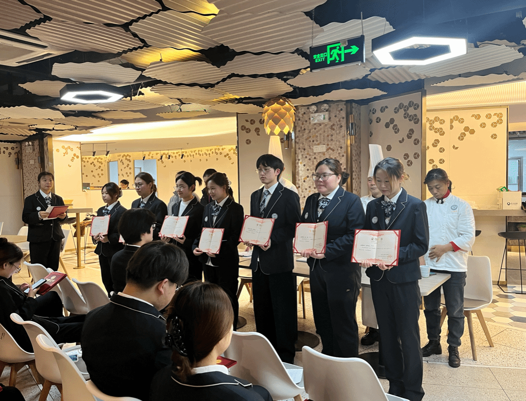 接下来各位老师为见习餐厅经理、见习厨师长和各部门见习主管颁发聘书,并为先进班组、先进管理岗和先进个人颁发荣誉证书。这是对于管理岗同学们付出的认可,也是对在各个岗位上工作积极、认真、负责并起到带头作用的同学们的肯定和鼓励。