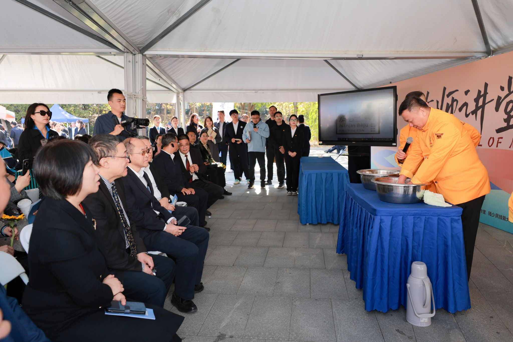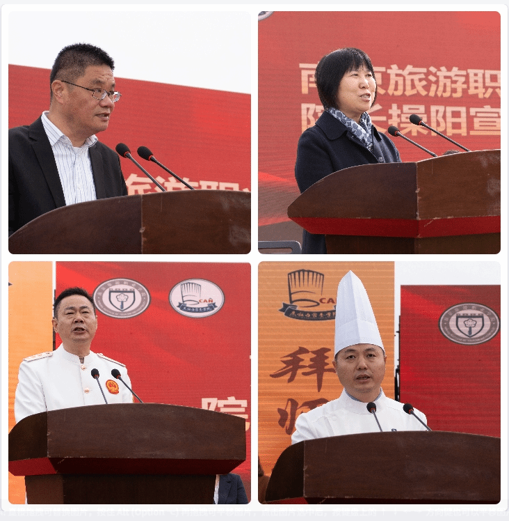 美食文化艺术节在庄重的拜师仪式中拉开帷幕,烹饪与营养学院院长吕新河致欢迎词,他提到,烹饪从来不是简单的“锅碗瓢盆交响曲”,而是承载文化、对接产业、服务民生的重要载体,师徒相授、口传心授是中华烹饪技艺赓续千年、生生不息的核心密码;南京旅游职业学院党委书记叶凌波在致辞中强调,举办拜师仪式是技艺的传递,更是匠心的接力,学院将依托人工智能烹饪基地、产业学院和馆校合作平台,让职业教育对接市场、对接时代、对接每一个学生的未来;南京旅游职业学院院长操阳宣布美食文化艺术节正式开幕。