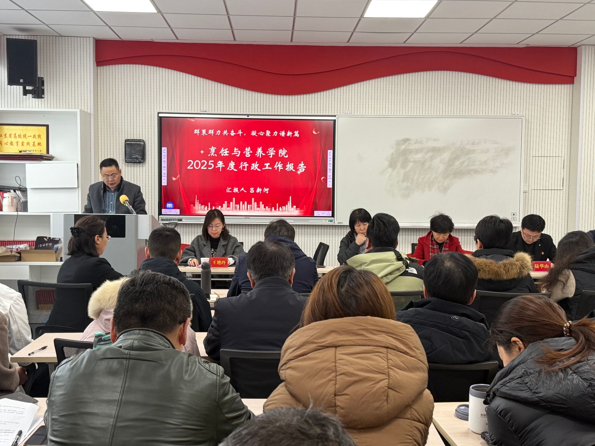 吕新河首先作《烹饪与营养学院2025年度行政工作报告》。报告立足高水平专业群建设、校企合作协同发展、师资队伍建设、科研创新突破、学生成长成才、实习实训基地提质、提案办理答复、预算执行落实等十个核心板块,系统梳理过去一年学院各项工作取得的成绩与积累的宝贵经验,深入分析当前发展面临的机遇与挑战;报告指出2026年学院将紧扣时代发展脉搏,聚焦烹饪与营养领域前沿趋势,持续深化改革创新,推动各项工作再上新台阶。