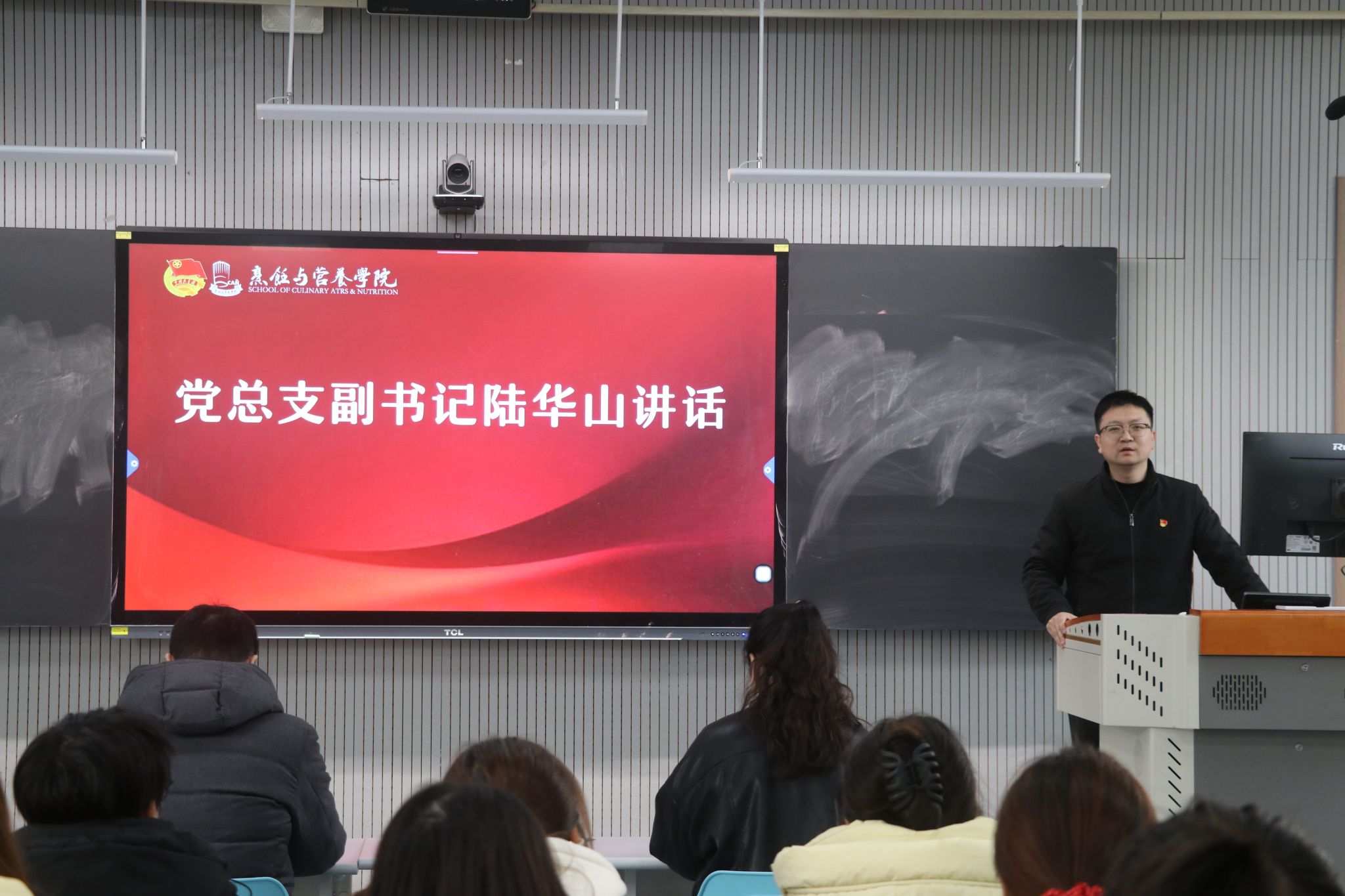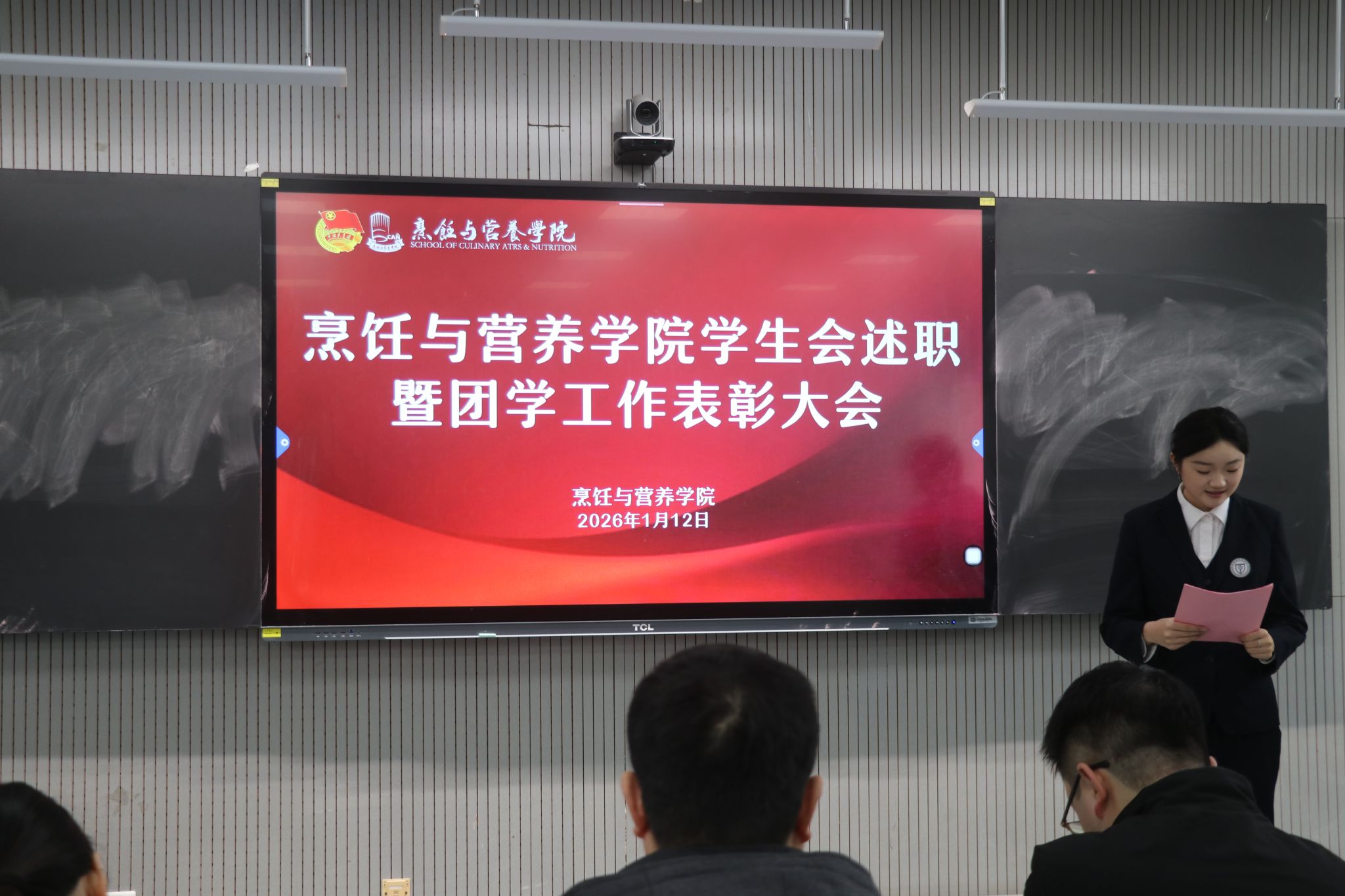 为全面总结团学工作成效,表彰先进典型,凝聚奋进力量,2026年1月12日,烹饪与营养学院团总支组织召开2025年度学生会述职暨团学工作表彰大会。学院党总支副书记陆华山、实训中心主任高志斌、学工党支部书记张莉、团总支书记段牡钰出席会议,25级学生会成员及全体班助参加会议,会议由学生会主席张冉主持。