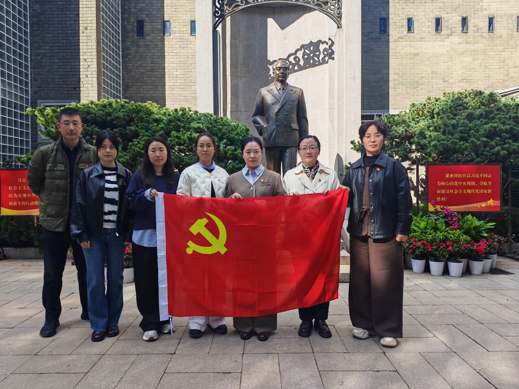 活动以“走进原址、沉浸学习”为主线展开。党员们先后走进梅园新村17号、30号、35号等旧址点位,在会议室、抄报室、电讯室等原状空间前驻足学习,体悟谈判期间高强度文电往来、新闻发布与外联协调背后的组织纪律与责任担当;在生活起居陈设中,感受老一辈革命家在复杂斗争环境中的从容坚毅与为民情怀。随后,大家在专题陈列区系统学习相关历史图片、文献手稿、新闻报道与影像资料,沿着时间线回望关键节点,直观把握“求和平、谋团结、促民主”的历史逻辑与精神底色。周恩来铜像前,两个支部的党员教师集体重温入党誓词,庄严肃穆的仪式进一步锤炼了理想信念和宗旨意识。