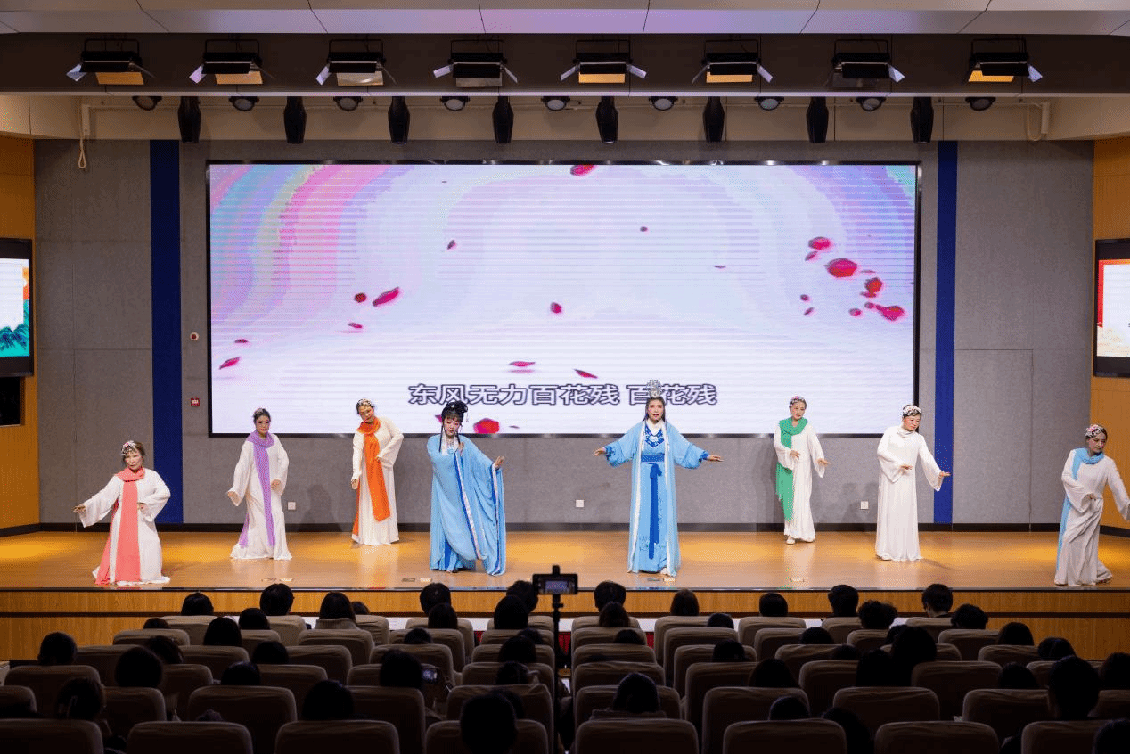 越音艺术团是江苏省优秀团队、江苏省文化馆共建团队。该场演出涵盖越剧、豫剧、黄梅戏等多个经典戏曲剧种,以多元形式为师生们铺开一幅璀璨的传统艺术长卷。其中,越剧这朵绽放在中华戏曲苑中的清雅奇葩,滥觞于浙江绍兴嵊州的烟雨氤氲间,它以情为骨、以唱为魂,唱腔婉转如流泉漱石,清越动听;唱词雅致似兰芷吐芳,脱尘出俗;扮相更是俊逸翩跹,尤以 “坤生”(越剧女小生)为绝,较之其他剧种的男小生,更添几分风华卓绝的倜傥韵致。