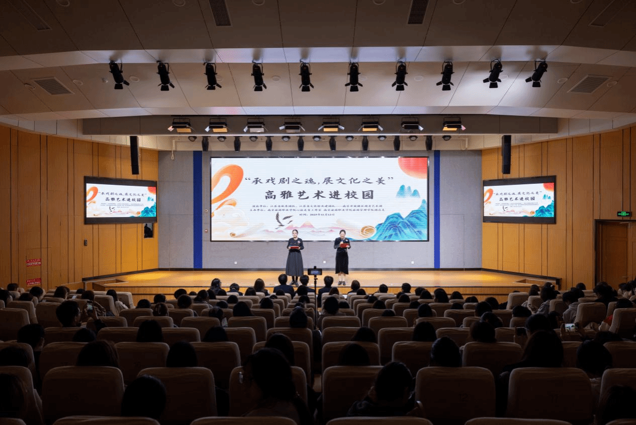 为赓续中华文脉,弘扬戏曲瑰宝,厚植民族文化自信,2025年11月13日18:00,“承戏剧之魂,展文化之美”高雅艺术进校园活动在学校“一站式”社区报告厅隆重启幕。本次活动由南京旅游职业学院心弦美育工作室、旅游管理学院团总支联合主办,特邀南京市鼓楼区越音艺术团倾情演绎,旅游管理学院党总支书记夏梦和越音艺术团成员梁红共同主持,南京旅游职业学院副院长洪涛出席,与全校300余名师生共赴这场视听盛宴。