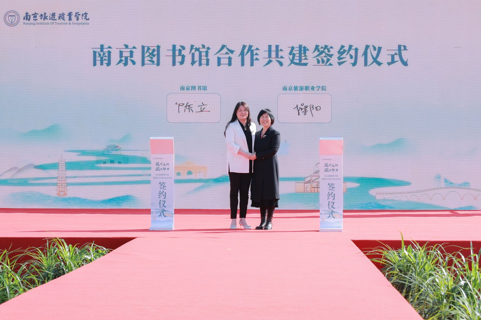 11月5日上午,南京旅游职业学院与南京图书馆正式签署合作共建协议,现场举行了简洁而庄重的签约仪式。南京图书馆同时向我院赠送了馆藏珍品——清代彩绘本《运河全图》复制件。此次合作标志着双方将在资源共享、文化育人、学生实践、党建共建等方面展开更深入的交流合作,通过资源双向流动、协同育人,实现公共文化服务与职业教育深度融合。