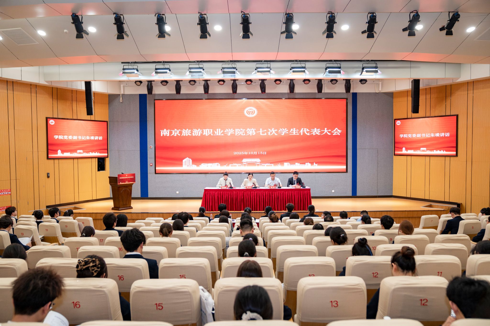 10月15日,南京旅游职业学院第七次学生代表大会在图书馆报告厅顺利召开。大会包括预备会议和正式会议两部分。预备会议听取会议筹备工作情况,审议并通过代表资格审查报告、大会主席团成员及秘书长建议名单等会议议程。