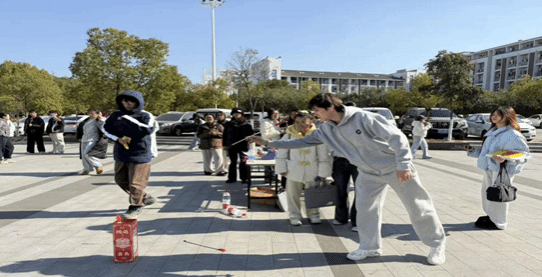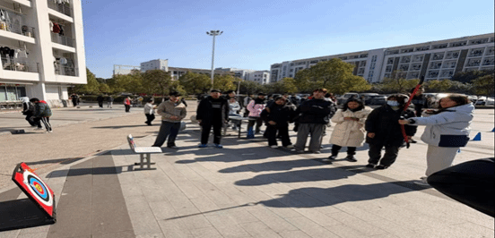 活动现场,踢毽子区的羽毛毽上下翻飞,老师与学生组队“对战”,计数声与欢笑声此起彼伏;投壶区前排起长队,大家手持箭矢瞄准壶口,偶尔的“精准命中”会引来一片喝彩;射箭体验区里,党员教师耐心示范姿势,学生们拉弓、瞄准、放箭,在专注中感受传统体育的魅力。武术社团的刀剑展演和健身气功表演让活动达到了高潮。